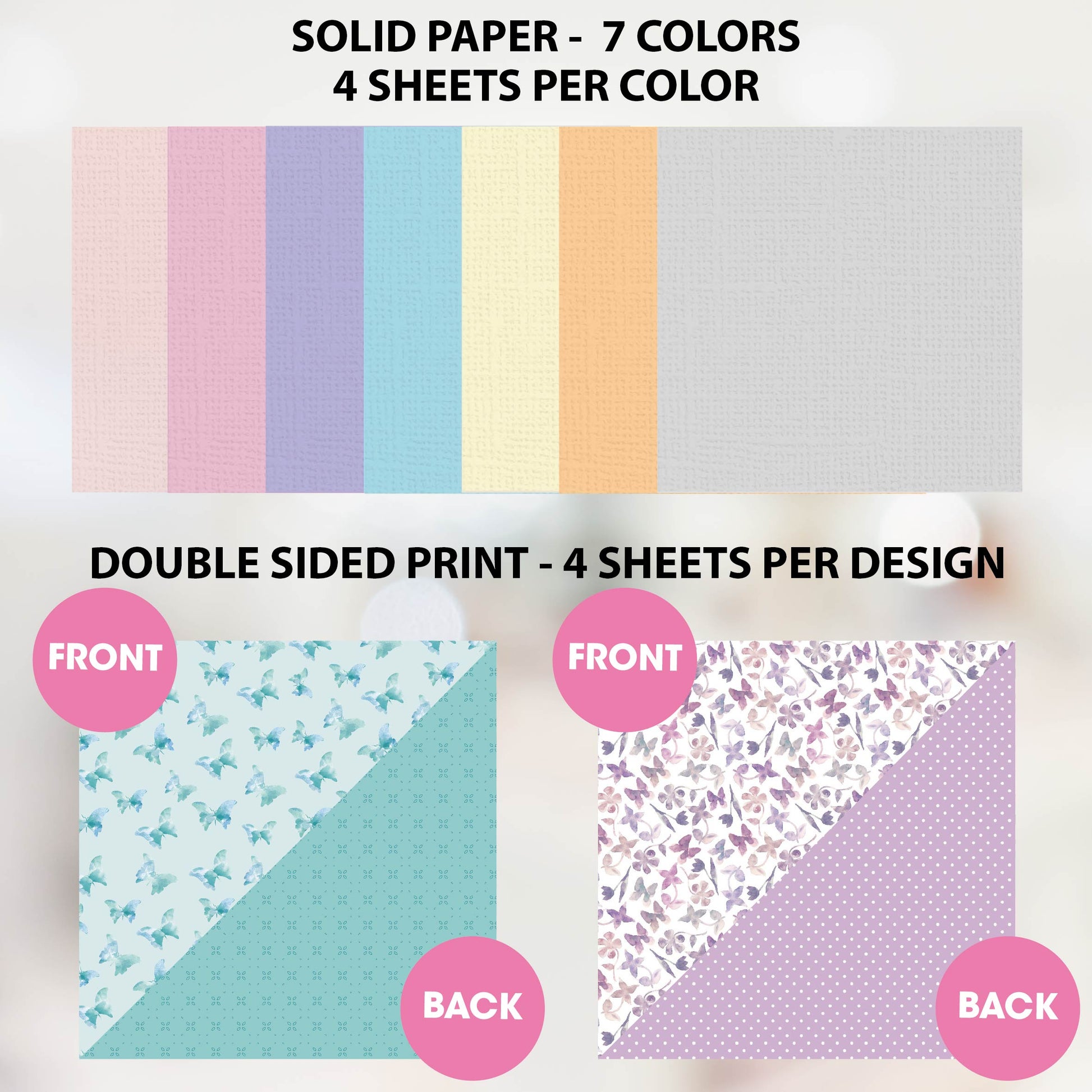 - 28 sheets of textured solid cored colors, 7 colors. And 8 sheets of textured double sided floral patterned paper for scrapbooking.